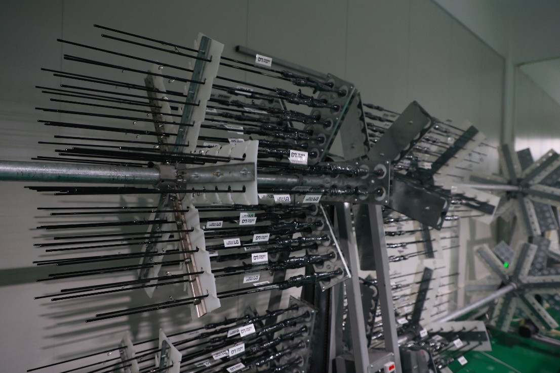 路亚竿在涂刷环氧树脂后,需要旋转风干以保障涂刷均匀。