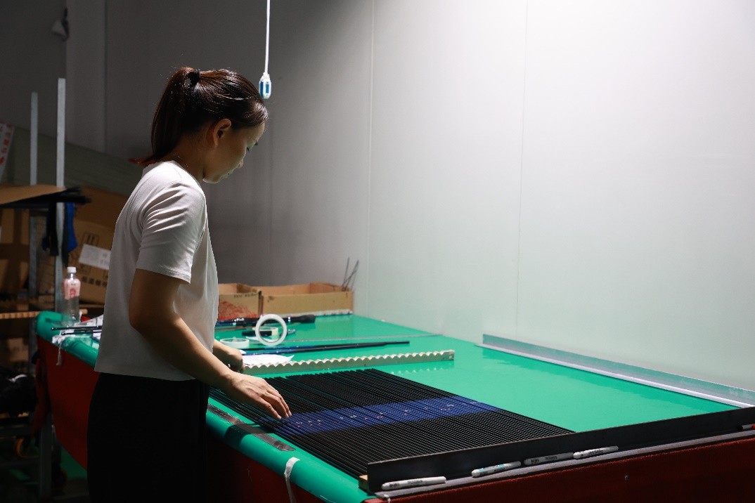 钓具生产的大部分环节仍为手工完成,工人正在对竿节进行质检。