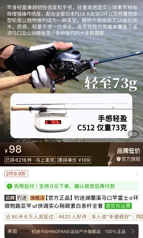 原材料的突破和量产使路亚竿的成本大幅下降。2023年,张荣波在拼多多推出了首款路亚竿,以重99克,100元左右的价格,“成了很多年轻人的第一支路亚竿”。