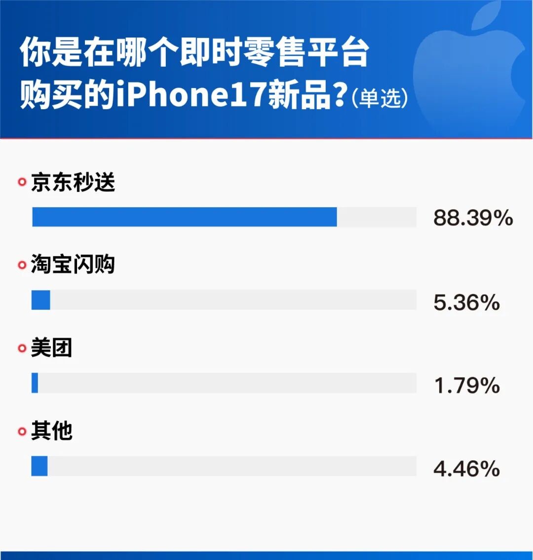 此外,问卷数据显示,88.39%的用户在选择即时零售渠道购机时会选择京东秒送。这一方面体现了京东即时零售业务的运营能力,也是用户在手机品类的心智反映:想要“最快”拿到新机,第一时间想到的是京东秒送。