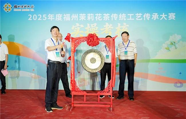 福州海峡茶业交流协会常务副会长、市农业农村局原一级调研员王贞锋在总结讲话中,为这场赛事赋予了更深层的意义:“本届大赛不只是手艺人之间的技艺较量,更是一场茉莉茶香里的文化盛宴,一次非遗传承人才的集中检阅,更是推着福州茉莉花茶产业往更高处走的关键契机!”他满怀期待地寄语所有选手:“期待大家拿出最佳状态,在赛场上亮出真本事、赛出高水准!”话音落时,他亲手敲响铜锣,清脆的锣声在赛场回荡,正式拉开了本次大赛实操考核的序幕。