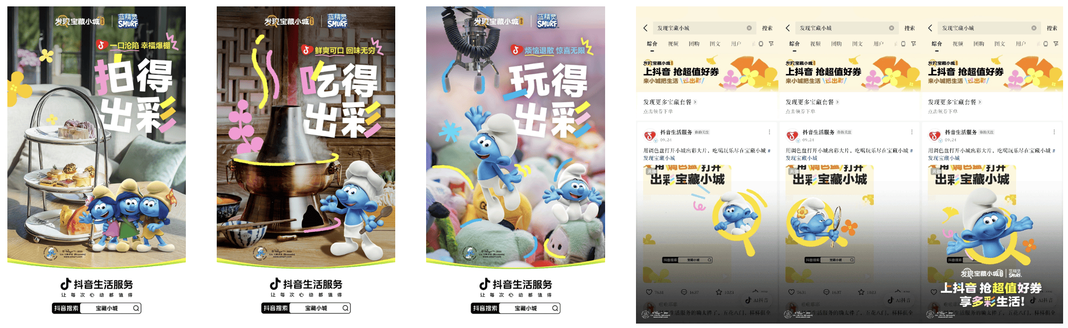 「发现宝藏小城-超出彩」联动无数人的童年回忆——蓝精灵,借助其生动可爱的形象,吸引用户自然而然地融入其中。在抖音平台搜索“发现宝藏小城”即可触发蓝精灵互动动画——可爱的蓝精灵惊喜亮相,向你发出邀请,一起开启这场宝藏小城探索之旅。让用户跟随它们灵动的步伐,共同收获一场 “拍得出彩、玩得出彩、吃得出彩” 的缤纷假期。