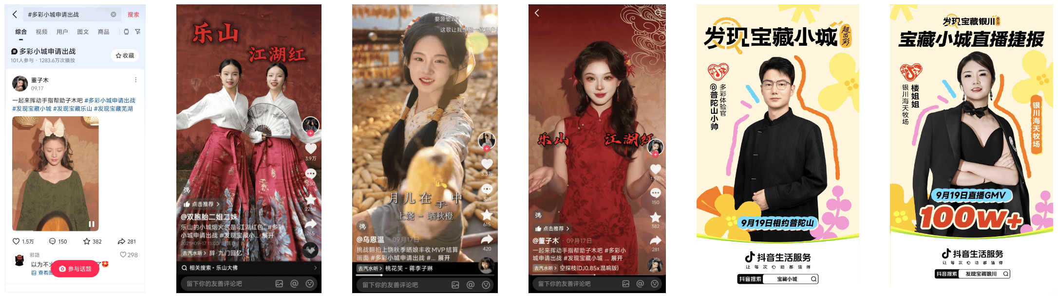 与此同时,更多达人以亲身游历深度体验小城风情,用鲜明个人风格诠释地域特色,构建沉浸式的内容体验,让用户真正“入画”。变装达人们巧妙的将小城本色披上了身。@双胞胎二姐二妹 穿上大红马面裙,演绎豪情万丈的乐山“江湖红;@乌恩温 走入上饶化身晒秋少女,传达丰收的喜悦。@董子木、@言欢、@龙恩星、@奇阿奇等更多达人都纷纷加入,成功点燃众多网友的出行灵感,#多彩小城申请出战 话题热度被点燃,播放量超1200万次。@普陀山小帅作为“出彩体验官”,共同助推小城热度;在“发现宝藏银川”直播中,银川海天牧场@楼姐姐单日直播GMV便突破100W+,进一步放大小城的传播声量。
