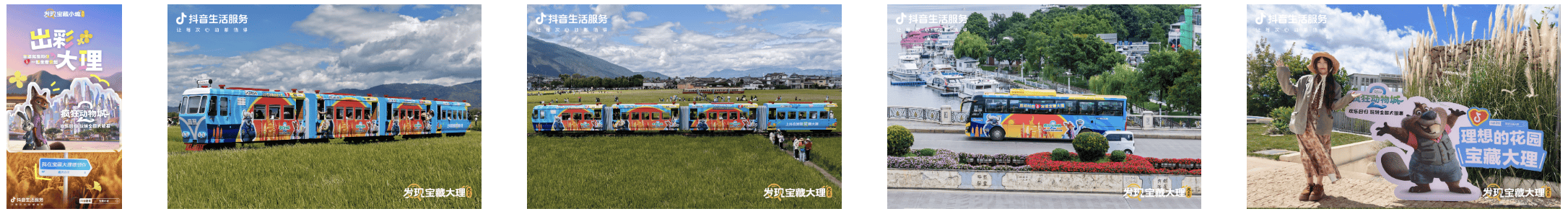 风靡全球的《疯狂动物城2》主角朱迪和狐尼克来到喜洲古镇,宣告续作回归的同时,也为当地带来浓郁的童话气息。为此打造的“疯狂动物城”主题公交旅游大巴和喜洲稻田主题小火车,将动画世界的欢乐氛围融入大理田园风光和日常生活的旅途之中,为游客打造了一场麦田里的童话之旅,成为文旅联动的亮眼案例。同时,活动还设置了角色立牌打卡点供游客打卡留念,极大提升了现场的沉浸感与趣味性。不少游客在此驻足,与角色合影留念并主动在抖音分享,推动#发现宝藏大理 #我们的喜洲时光 等话题迅速升温,播放量分别突破3600万次和480万次,形成一波持续的打卡传播热潮。