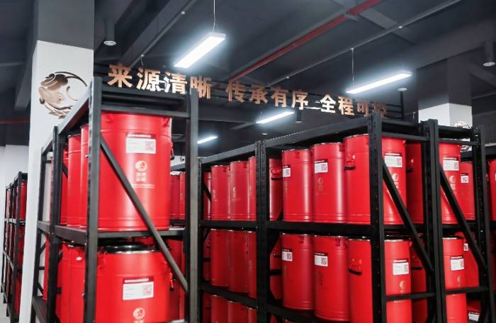 新仓内,一排排红色陈化桶整齐排列,每个桶身都配有带二维码的"身份证",标注原料名称、代码、仓库位置等信息,实现全程可追溯。24小时智能监控系统实时监测温湿度,科技与传统完美融合,确保每一片大红袍"来源清晰、传承有序、全程可控",为优质陈化保驾护航。