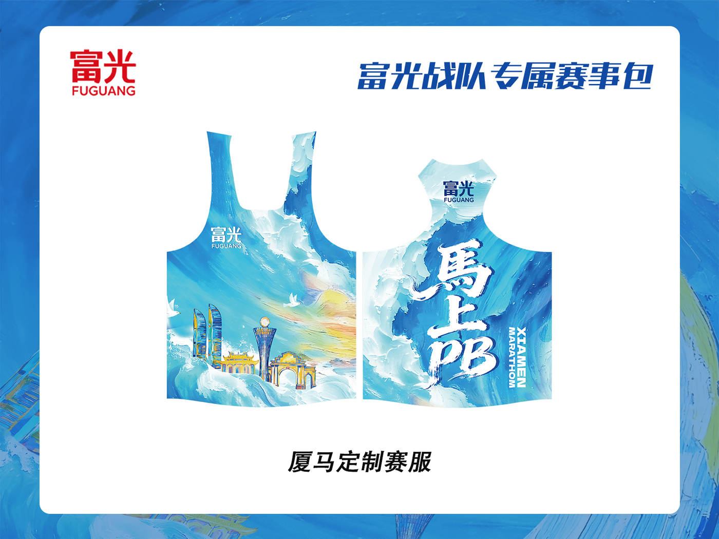 赛事包内,映入眼帘的正是富光为品牌战队成员设计的专属赛事服。赛事服整体采用清新的蓝白配色,如鹭岛之畔翻涌的浪花,叠映朝霞浸染的云纹,将厦门特有的海滨浪漫勾勒于衣间。浪花之中,双子塔、海上明珠观光塔等厦门地标轮廓的剪影跃然其上,为奔跑的身姿注入一抹鲜明的城市活力。