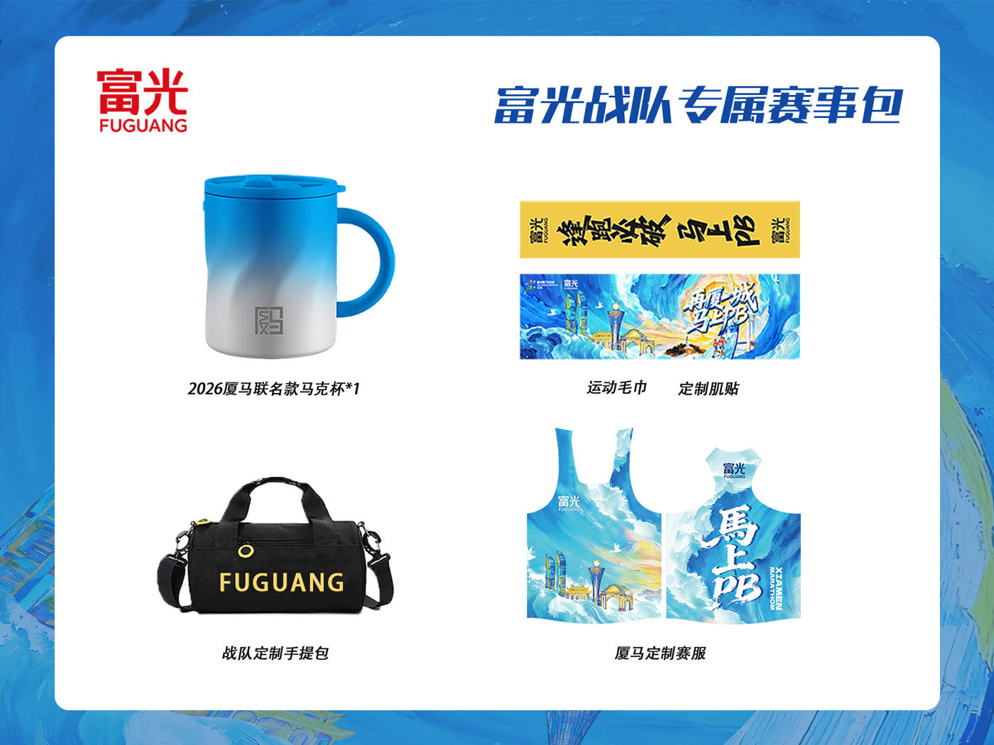 而与赛事服同样重要的,是为全程保驾护航的补水装备。面对数小时的持续消耗,及时、便捷的饮水是跑者的刚需。因此,富光还在战队赛事包里配备了富光2026厦马联名款马克杯,杯身采用316L不锈钢材质,无论是能量饮料还是蛋白粉补给,都可以安心冲泡,帮助跑者随时恢复状态。此外,赛事包内还有运动毛巾、肌贴等多方位比赛装备,助力跑者以出色状态迎接厦马。